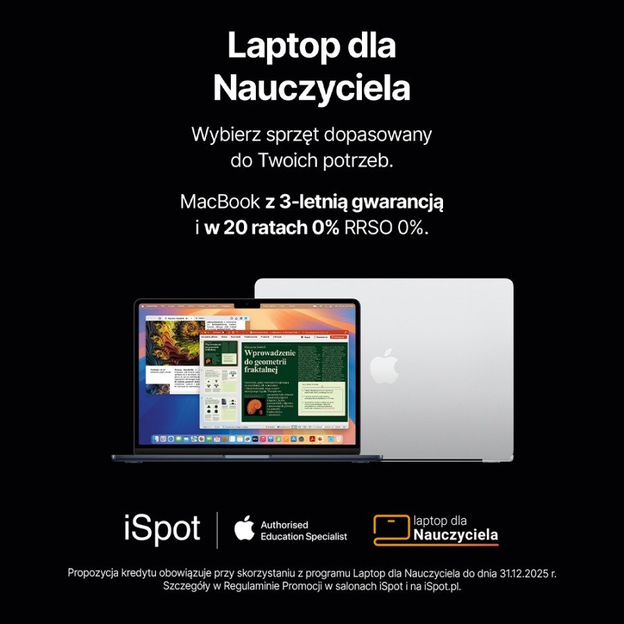 Bon dla nauczyciela – MacBook nawet 2500 zł taniej! Edukacja zasługuje na najlepsze narzędzia. Skorzystaj z wyjątkowego bonu i odbierz nawet 2500 zł rabatu na MacBooka! Promocja trwa do końca roku, a w pakiecie otrzymujesz: 3 lata gwarancji, wygodne raty To idealny moment, by zainwestować w technologię, która naprawdę pomaga w pracy.